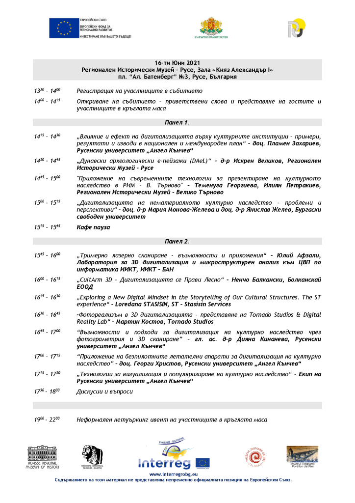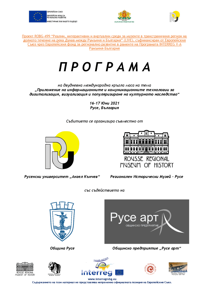 A two-day round table Application of ICT for digitisation, visualisation and popularisation of cultural heritage will take place in Rousse on 16-17 June 2021. The event is co-organised by Rousse University and the Rousse Regional museum of history and is generously supported by several other institutions and the Interreg project ROBG-499 “Live, interactive and virtual environments for the museums of the lower Danube cross-border area between Romania and Bulgaria” (LIVE).